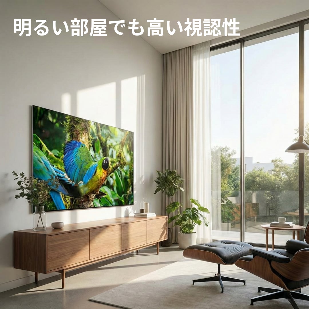• 明るい場所でも鮮明な「高輝度500cd/m²」&「アンチグレアパネル」 輝度500cd/m²の明るいパネルに加え、外光の反射を抑えるアンチグレア処理(ヘイズ値25%)を施しています。照明の映り込みを低減し、広い会場の隅々まで情報を届けます。
